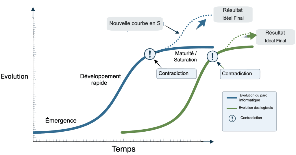 Pouvons-nous espérer réduire un jour ces ruptures ? Nous pouvons en douter. Pour illustrer ce propos, nous pouvons nous appuyer sur la Théorie de Résolution des Problèmes inventifs, développée par un Genrich Altshuller1. Cette théorie très présente dans le monde de l’ingénierie, affirme une règle universelle: celle de l’évolution différenciée des éléments d’un système. Chaque élément présente en effet ses propres contradictions techniques et physiques qu’il faut d’abord résoudre avant de l’intégrer au système. Chaque progrès d’un élément va ensuite ensuite provoquer des effets de bord et des contradictions sur d’autres éléments qui devront alors suivre la même démarche de résolution des contradictions.